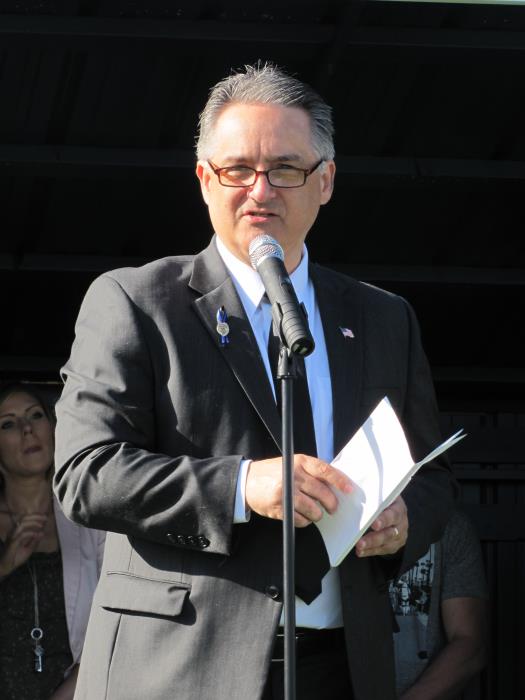 Mayor Steve Widmyer addresses veterans Saturday morning at the North Idaho Fairgrounds.